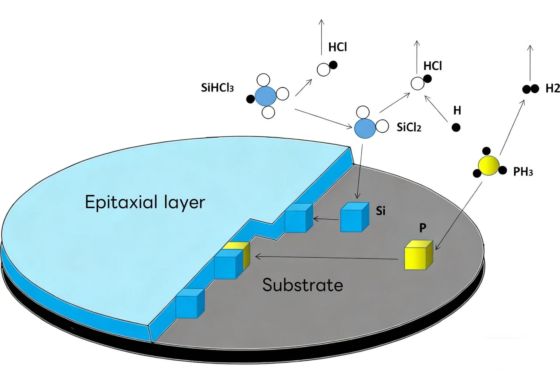 Pii epitaxy plerumque utitur vapore pascha epitaxy fornacis. Principium eius est quod dissolutio fontis Pii (ut silane, dichlorosilane, trichlorosilane, et silicon tetrachloridum reagit cum hydrogenio ad silicon generandum. Per incrementum, vapores dopingentes sicut PH₃ et B₂H₆ simul introduci possunt. Contentio doping praecise moderatur a pressione gasi partialis ad formandum iacum epitaxialem cum certa resistivitate.